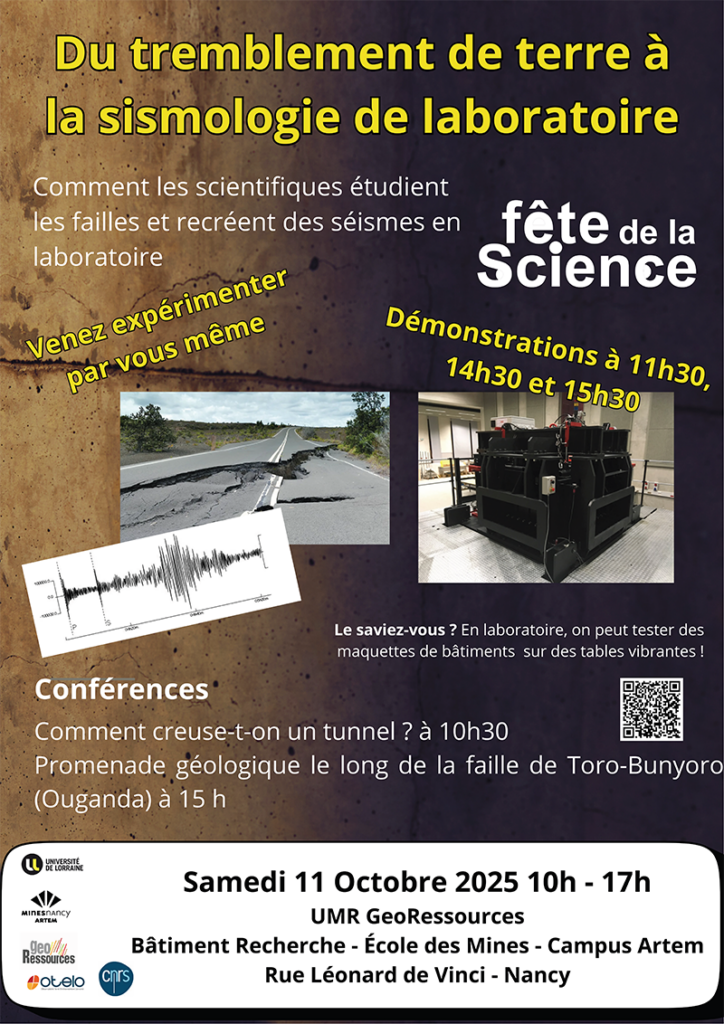 Rendez-vous à Mines Nancy, le samedi 11 octobre de 10h à 17h à l’occasion de la fête de la science 2025. Venez découvrir comment, à l’échelle du laboratoire, les équipes du laboratoire GeoRessources essaient de reproduire des évènements naturels comme les tremblements de terre…